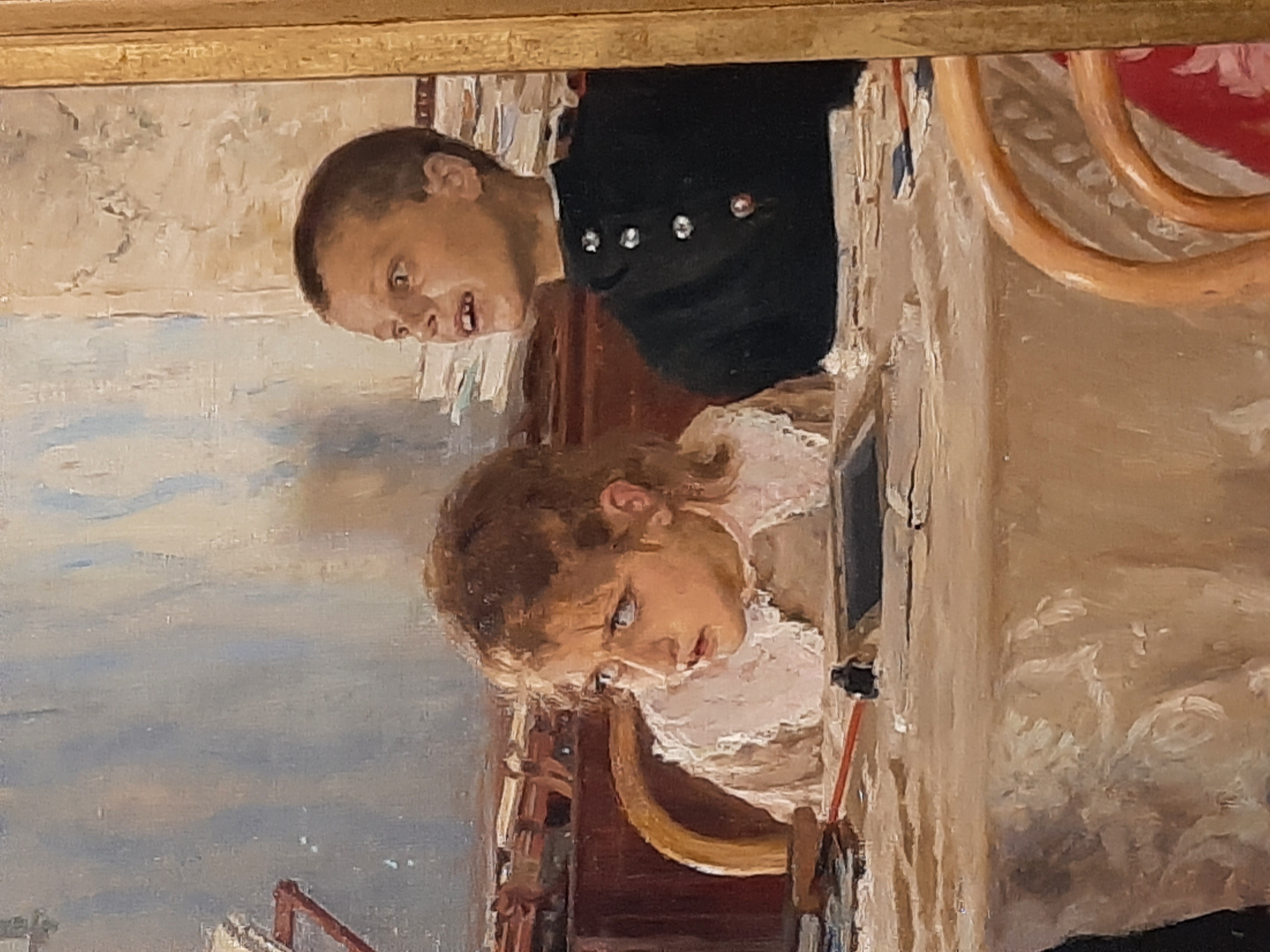 Ces petits garçons semblent dissipés ou trop bavards. Ils sont suivis d’un homme, élégant dans son costume noir, peut-être le patron de l’homme barbu qui les morigène et pourrait être leur père. Juste devant eux, une paysanne avec son fichu, bien différent du chapeau de la dame empreinte de dignité.